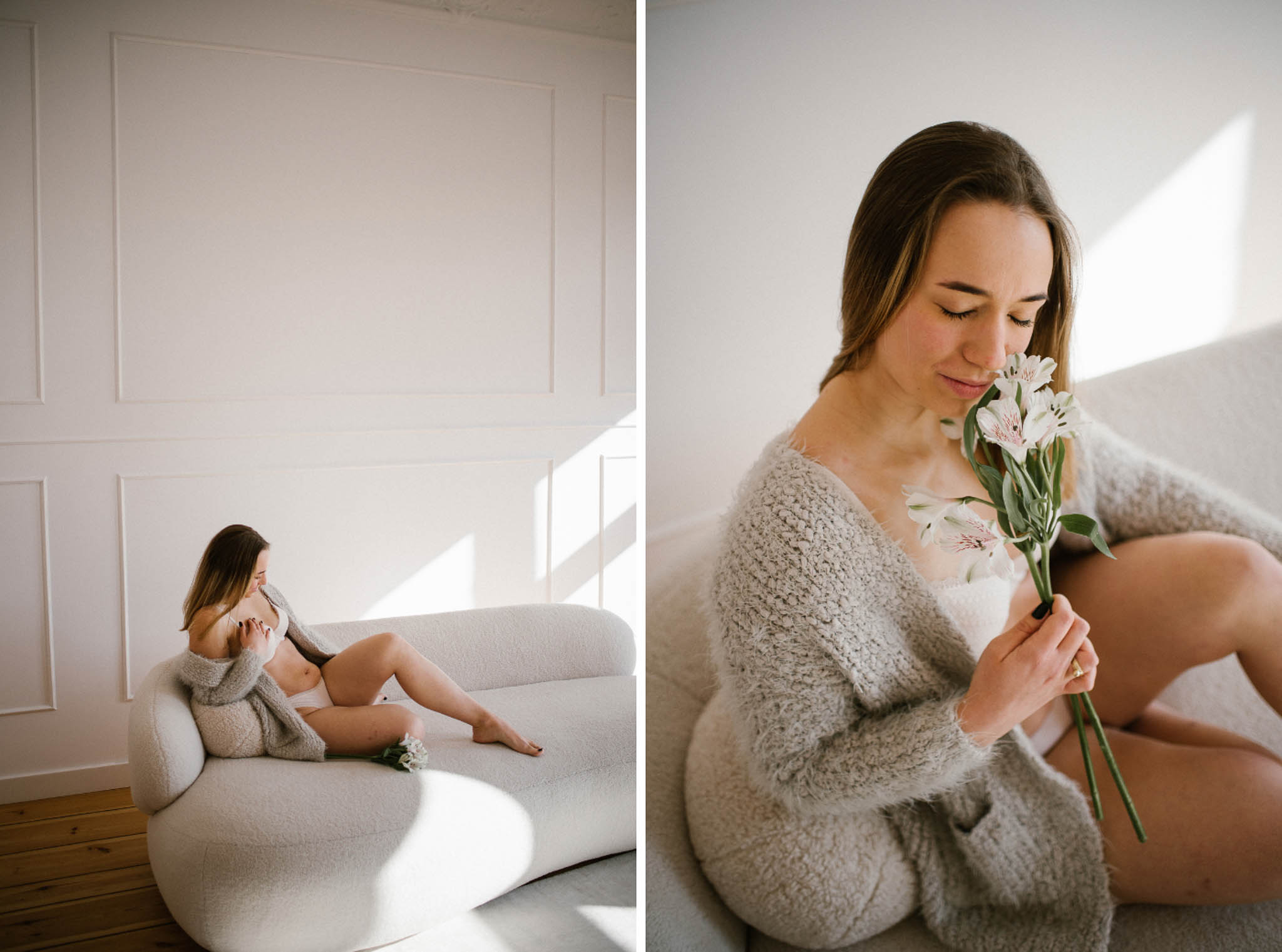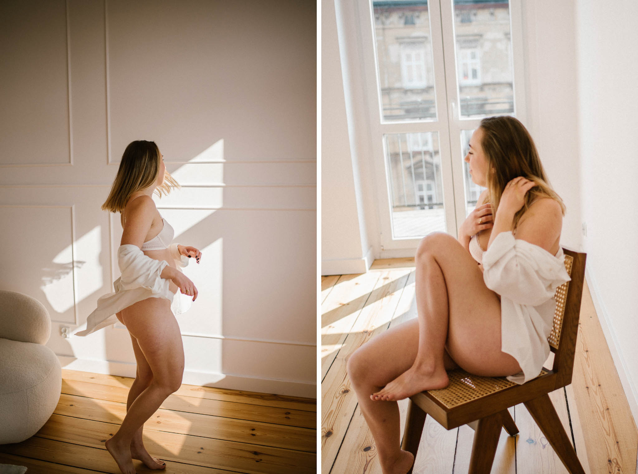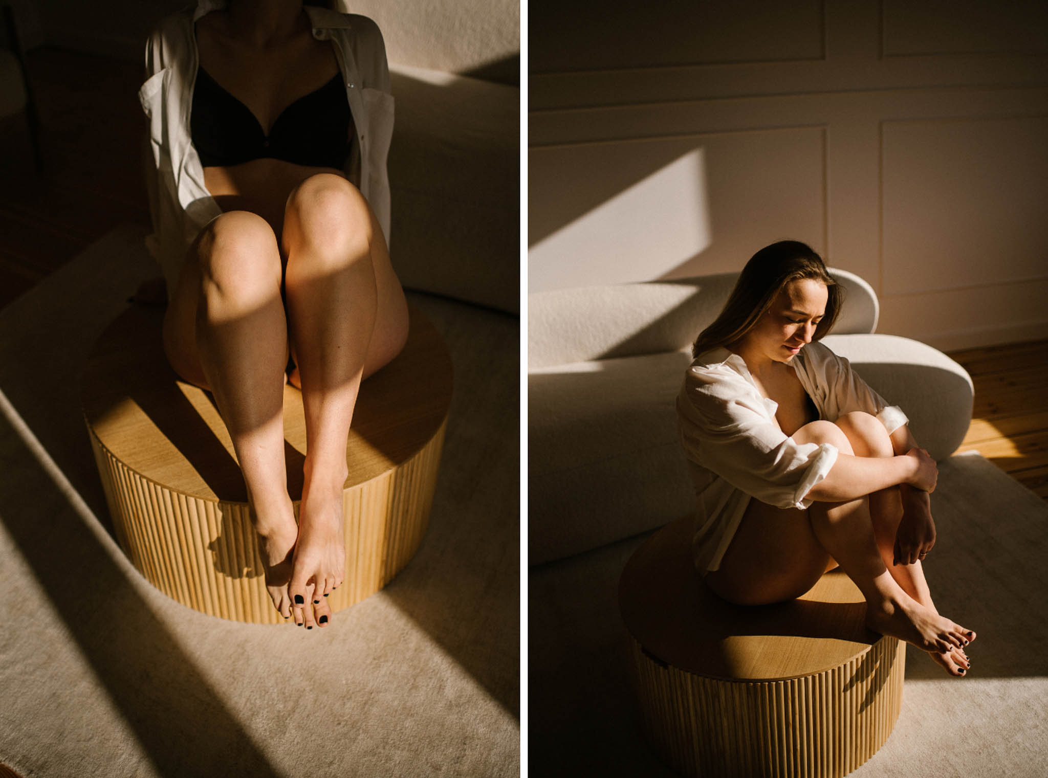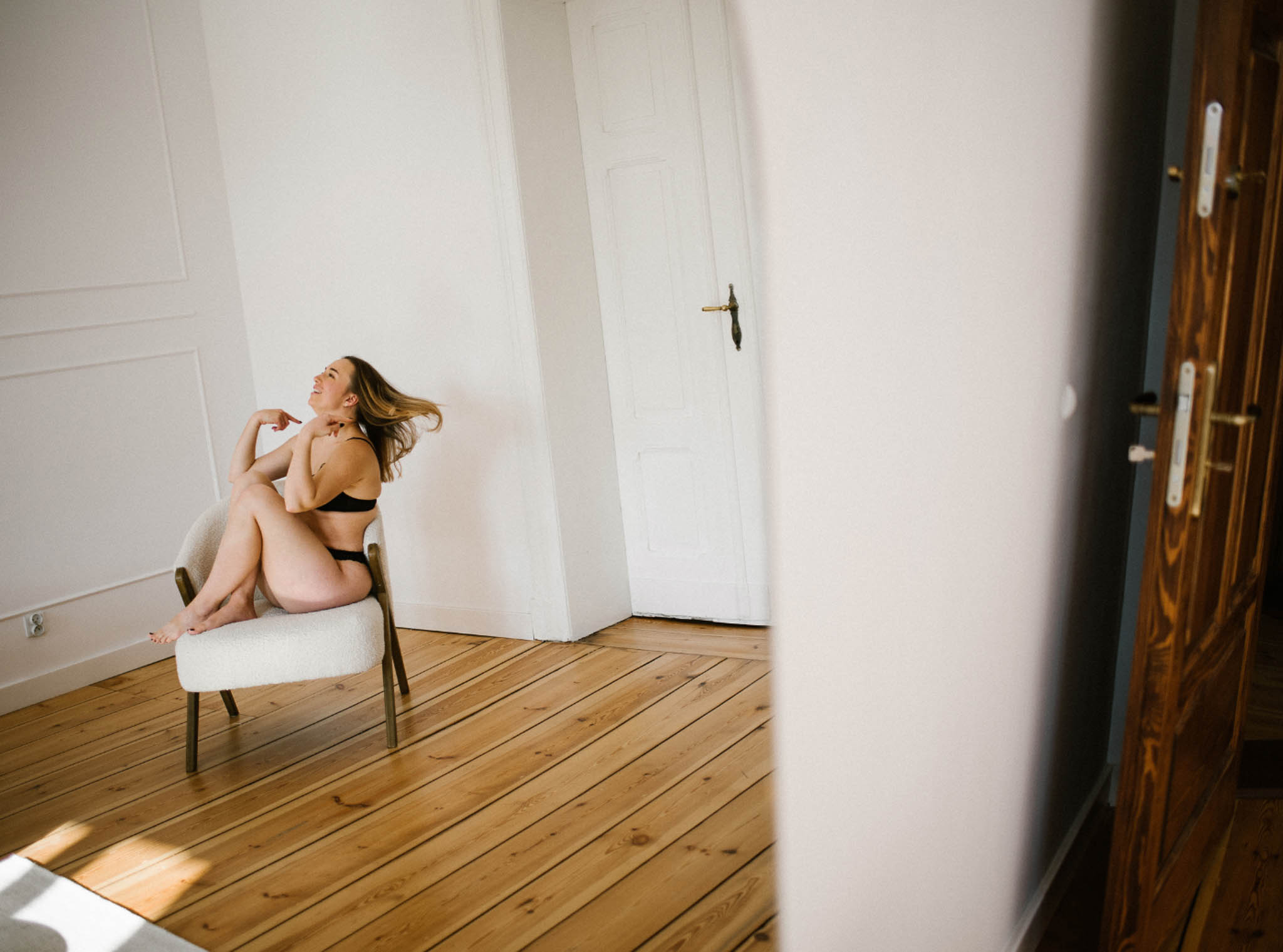 Wyszła z tej sesji lżejsza. Z innym spojrzeniem na swoje ciało. Z poczuciem, że kobiecość nie ma jednego kształtu, jednego światła ani jednego wieku. I że czasem wystarczy odrobina przestrzeni, światło i uważność, żeby zobaczyć siebie naprawdę.