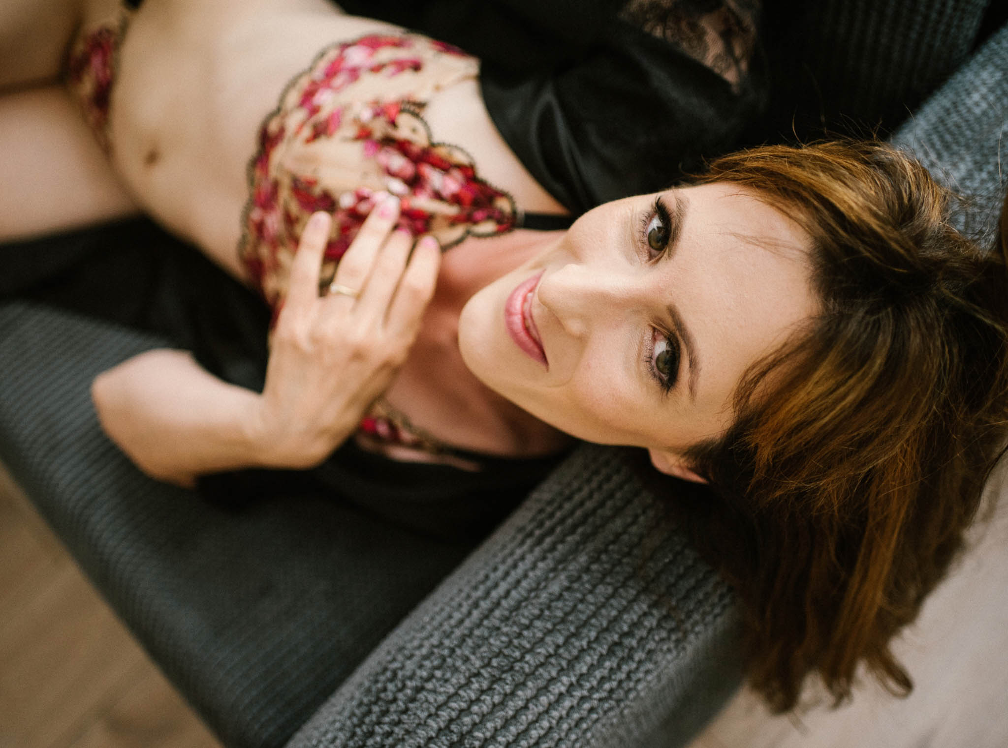 Widzę ruch włosów, który pojawia się spontanicznie. Widzę spuszczone oczy, pełne delikatności i napięcia jednocześnie. Widzę dłonie, które mówią więcej niż wyprostowana poza. Sensualność nie jest tu pozą. Jest w gestach, w spojrzeniu, w momencie zatrzymania.